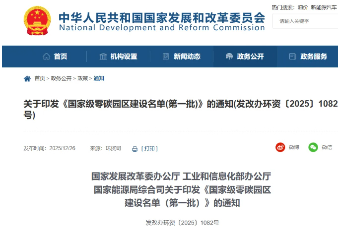 關(guān)于印發(fā)《國家級(jí)零碳園區(qū)建設(shè)名單(第一批)》的通知(發(fā)改辦環(huán)資〔2025〕1082號(hào))